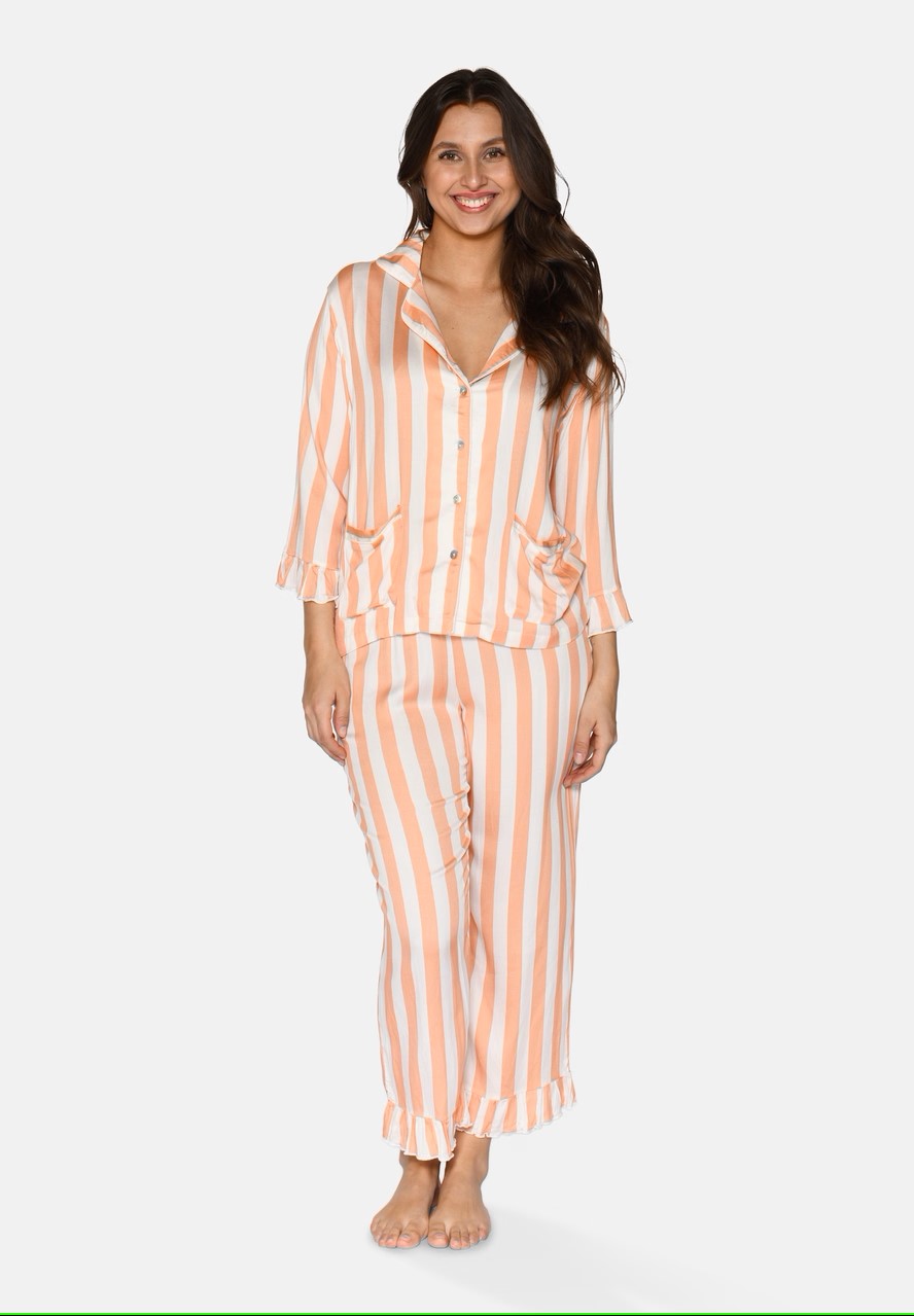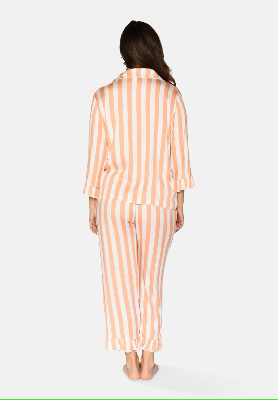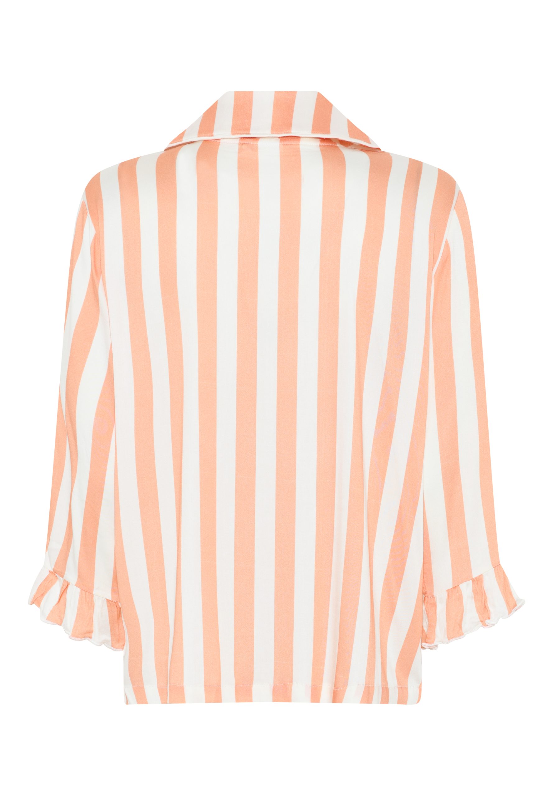Beinhvít með kóral litum röndum.
