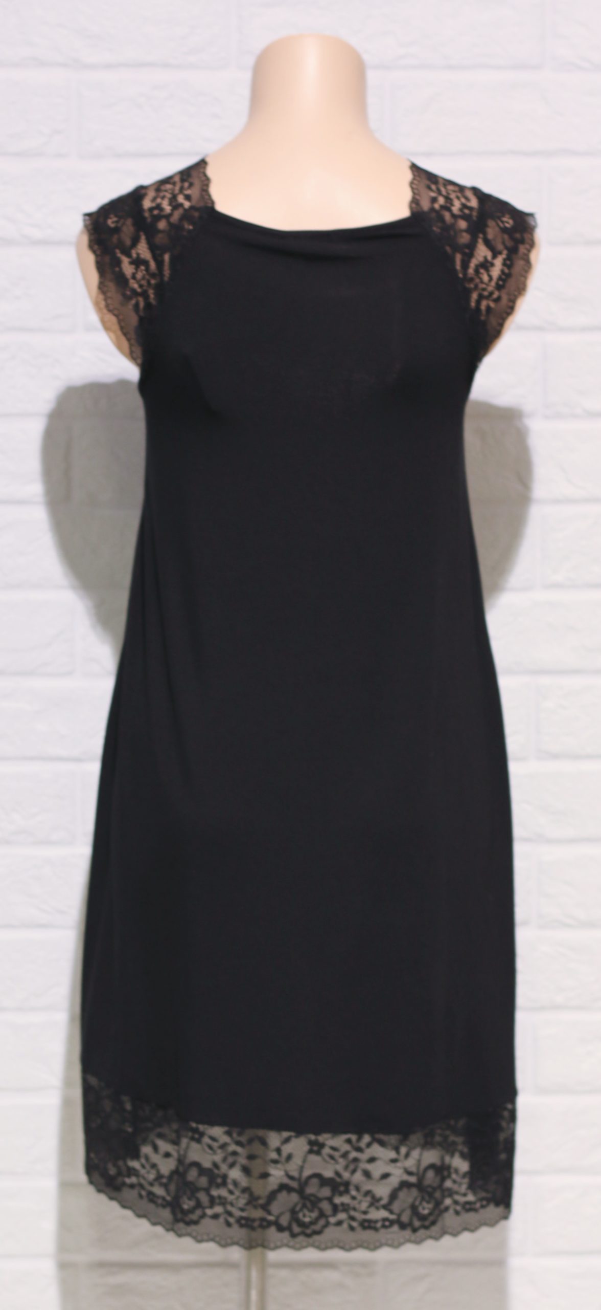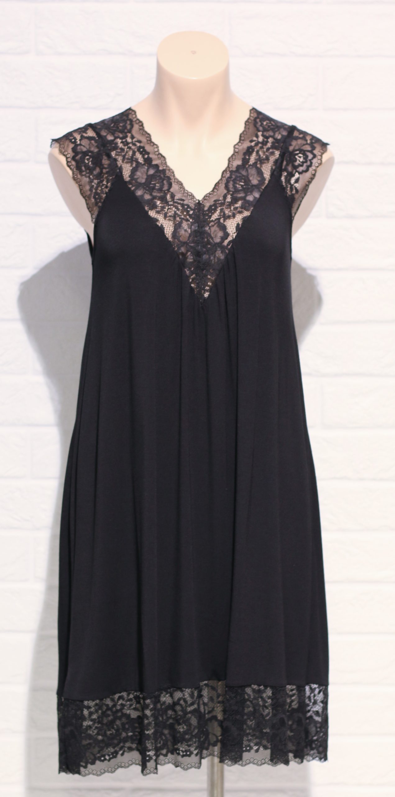 Svartur með breiðri, mjúkri blúndu í V-laga hálsmáli, yfir axlir og neðan á kjól.