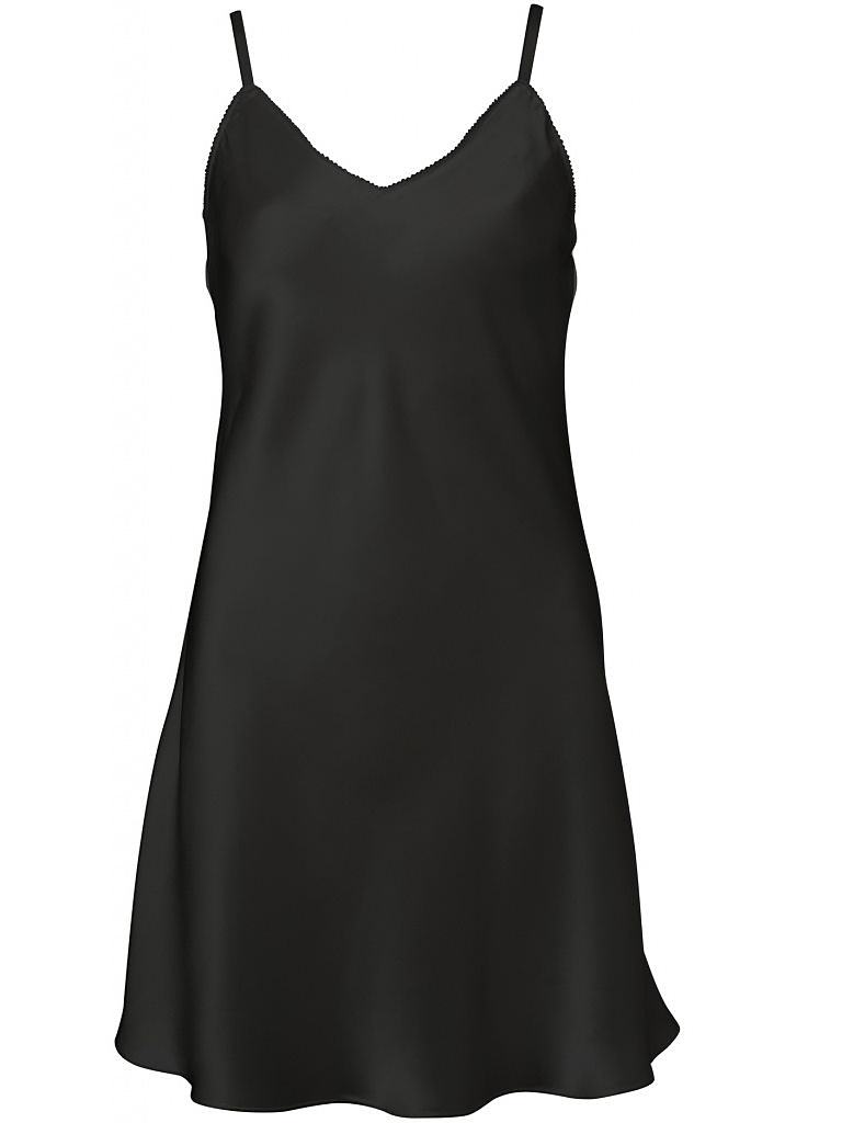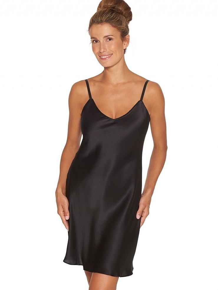 Svartur, sídd niður að hnjám og með mjóum stillanlegum hlýrum.